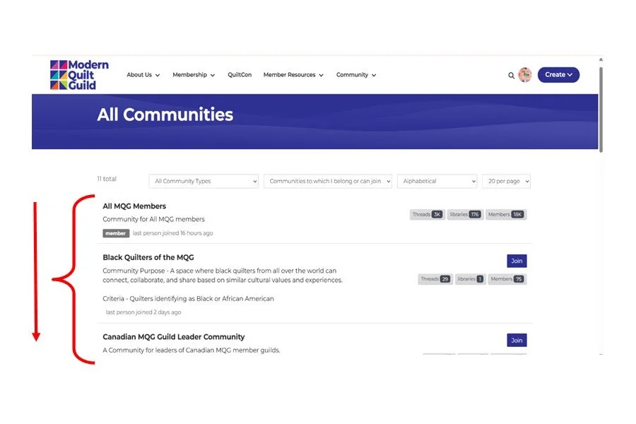 Every MQG member is automatically included in the All MQG Member Community. Since you belong to the Portland Modern Quilt Guild, you’ll also have access to our guild’s private community space.