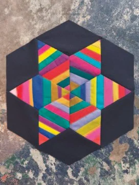 This is a fun workshop because it combines random piecing with a structured motif and it helps to use up the extra fabric around your space. First, we will make our scrappy sections. Next we'll cut scrap and solid diamonds. And finally, to level up your skills, we will use Y-seam construction to make a hexagonal scrappy star quilt block that measures approximately 14.25" wide x 12.25" high.